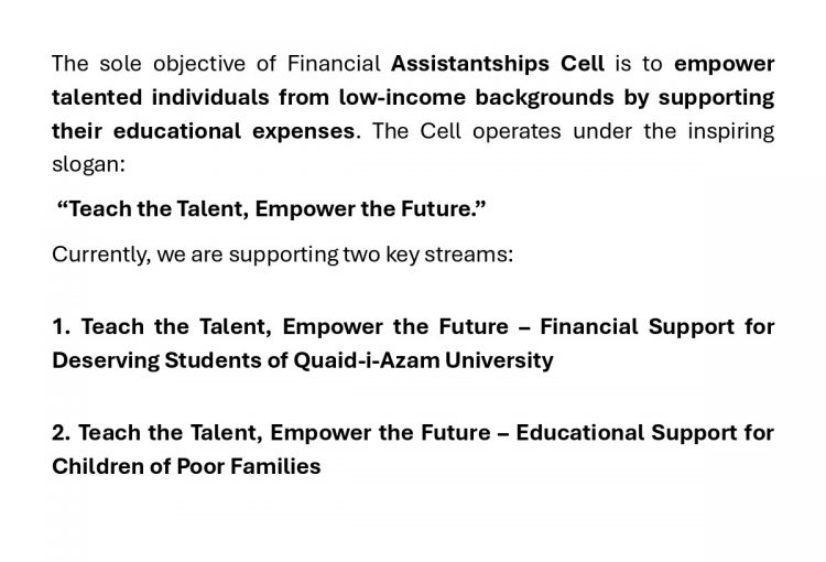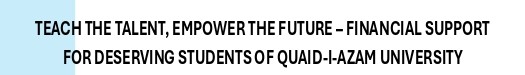Through this initiative, financial assistance is provided to QAU students by partially or fully covering their university dues, based on individual need. Over the past fifteen years, more than 620 financial assistantships, amounting to over PKR 12.5 million, have been awarded to deserving QAU students—enabling them to continue their education without financial barriers. The details will be uploaded in last week of December, 2025.
