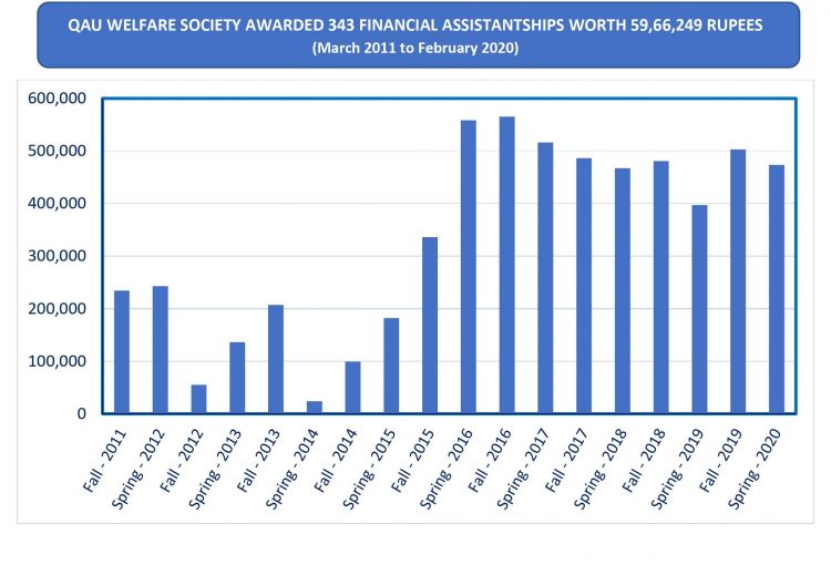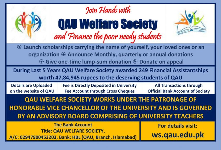 QAU Welfare Society awarded three hundred and forty three need based financial assistantships worth 59,66,249 rupees among the needy students of Quaid-i-Azam University. The amount was directly deposited in university account titled “Fees and Dues Account”.